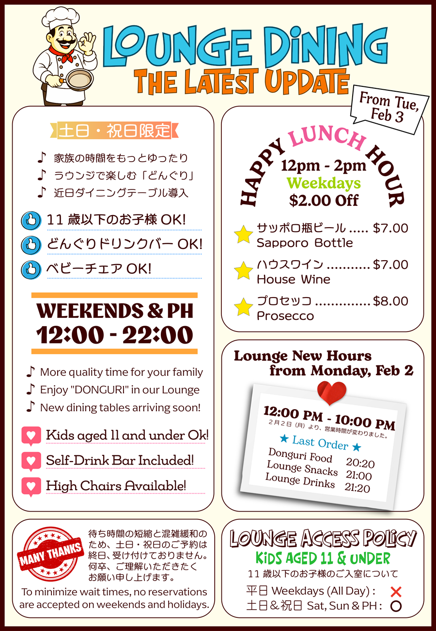 To improve your dining experience and reduce wait times at Donguri Restaurant, our Lounge is opening as an additional seating area on weekends and holidays.