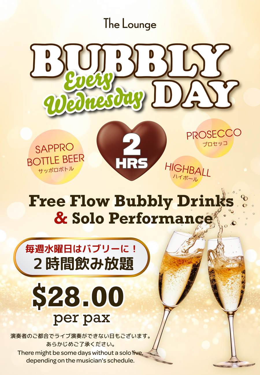 毎週水曜日はバブリーデー!とてもお得な泡ドリンクの飲み放題やっています。